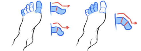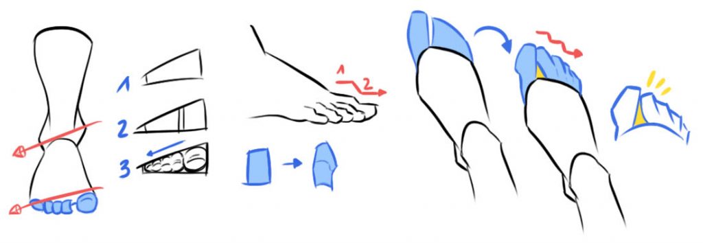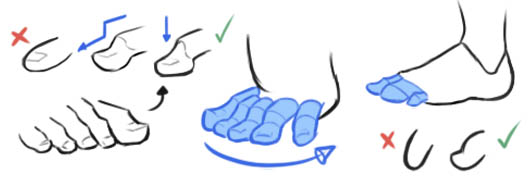 La petite astuce, c’est d’ajouter la forme d’un petit triangle entre le gros pouce et les autres orteils pour créer un espace vide. Ça permet de créer du mouvement simplement !