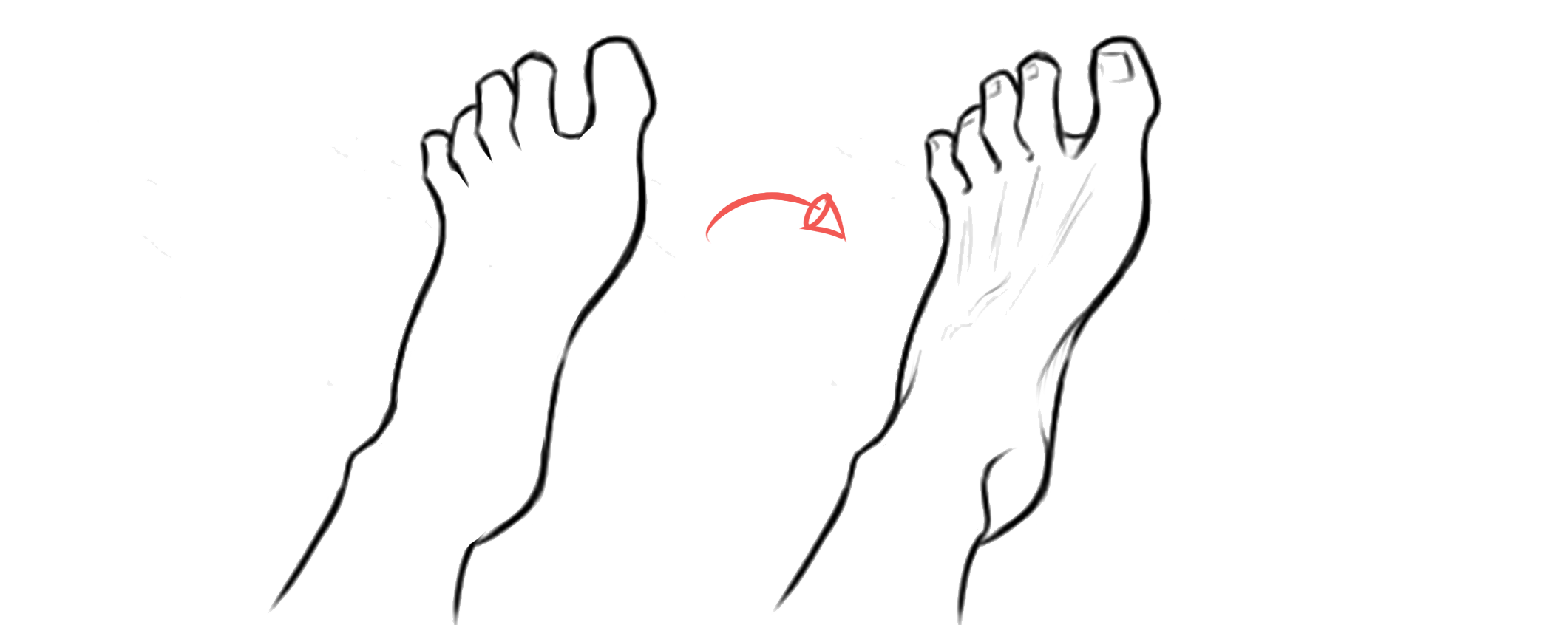 Les tendons sont généralement visibles sur le dessus du pied. Ils remontent vers la cheville. Tu peux simplement dessiner deux légers traits pour les suggérer.