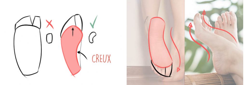 La plante du pied n’est pas droite. Elle est voutée et courbée. De dessous, c’est encore plus visible ! Elle est bien plus large que le talon et s’affine en son centre.