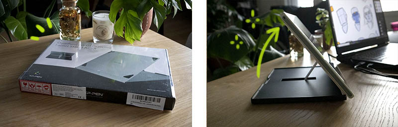 Malheureusement, le support pour tablette n’est pas inclus. Il faudra donc penser à se procurer un support si nécessaire. De mon côté, ayant besoin d’incliner la tablette plutôt que de dessiner à plat, je me suis orientée vers le support pour tablette AC18.